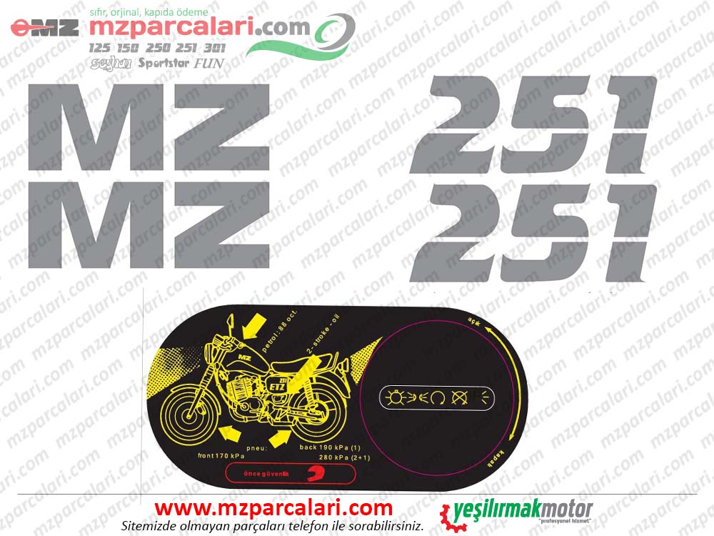 MZ 251 Etiket Takımı TİP 1 yedek parça online satış sitesi. Dünya'nın her yerine gönderim imkanı. Kredi kartı ile ödeme imkanı. Ayrıca dileyen kapıda nakit ödemeli sipariş verebilir.